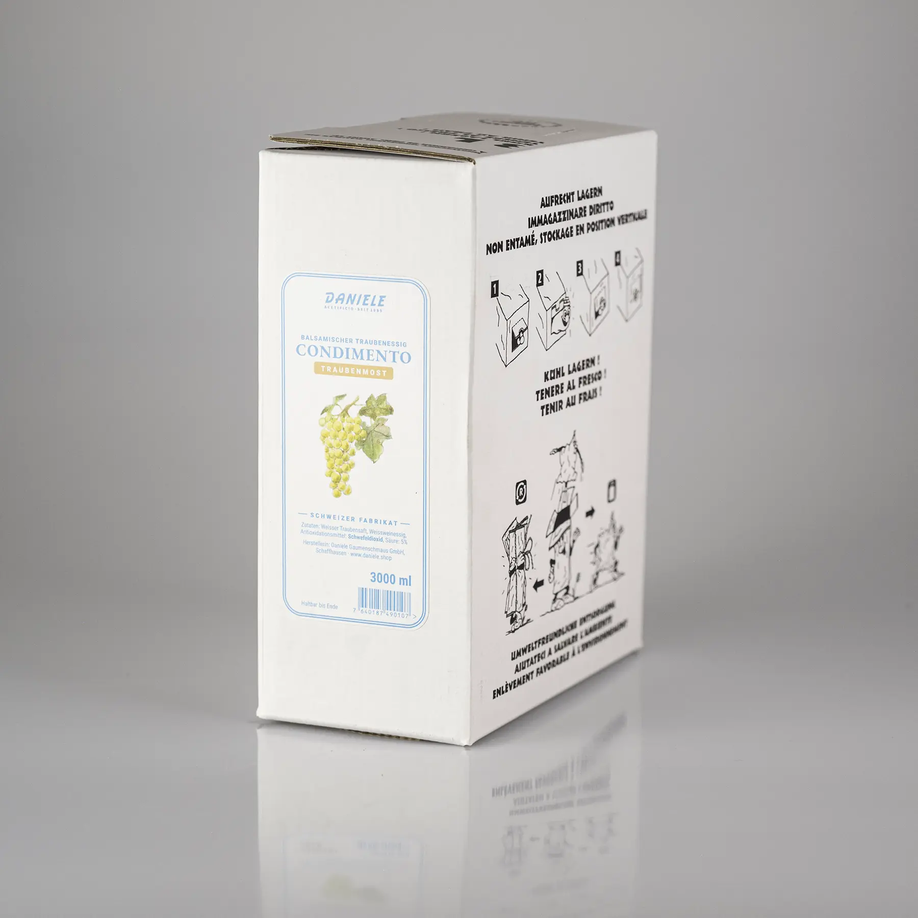 Der rund ¾ Jahre gereifter „Bianco“, verleiht dem Salat Geschmack, färbt ihn nicht ein. Die helle Frische wird sehr geschätzt, darum ist der Condimento in der Bag in Box abgefüllt. Nun ist dieser nicht mehr so schnell aus.